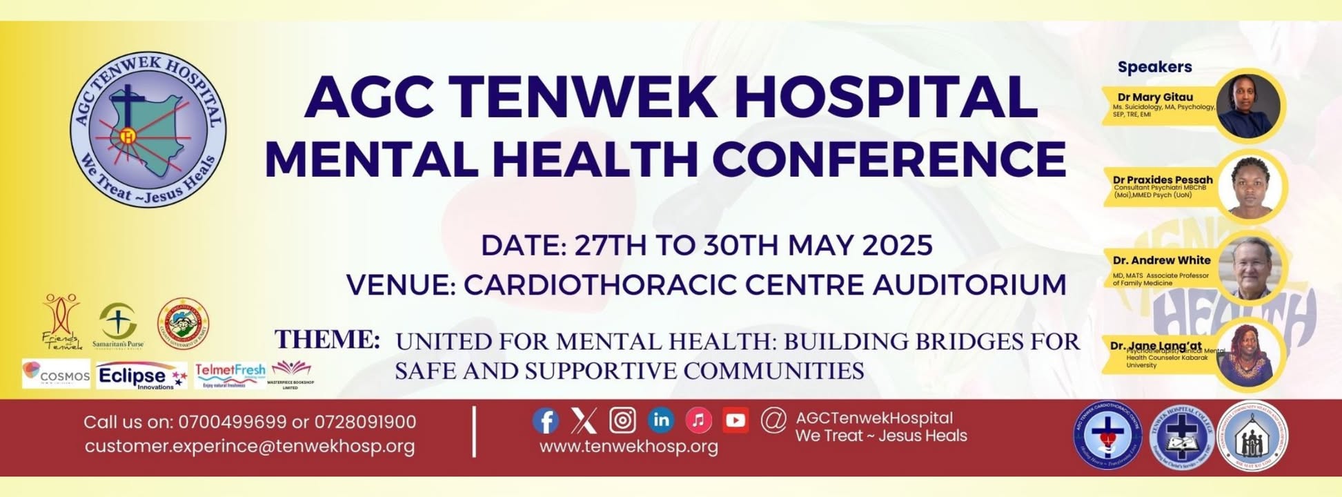 As Mental Health Awareness Month comes to a close, we're honored to spotlight an important upcoming event at Tenwek Hospital. 𝐀𝐆𝐂 𝐓𝐞𝐧𝐰𝐞𝐤 𝐇𝐨𝐬𝐩𝐢𝐭𝐚𝐥 𝐌𝐞𝐧𝐭𝐚𝐥 𝐇𝐞𝐚𝐥𝐭𝐡 𝐂𝐨𝐧𝐟𝐞𝐫𝐞𝐧𝐜𝐞 𝐌𝐚𝐲 𝟐𝟕–𝟑𝟎, 𝟐𝟎𝟐𝟓 𝐂𝐚𝐫𝐝𝐢𝐨𝐭𝐡𝐨𝐫𝐚𝐜𝐢𝐜 𝐂𝐞𝐧𝐭𝐫𝐞 𝐀𝐮𝐝𝐢𝐭𝐨𝐫𝐢𝐮𝐦(𝐂𝐓𝐂), 𝐓𝐞𝐧𝐰𝐞𝐤 𝐓𝐡𝐞𝐦𝐞: 𝙐𝙣𝙞𝙩𝙚𝙙 𝙛𝙤𝙧 𝙈𝙚𝙣𝙩𝙖𝙡 𝙃𝙚𝙖𝙡𝙩𝙝: 𝘽𝙪𝙞𝙡𝙙𝙞𝙣𝙜 𝘽𝙧𝙞𝙙𝙜𝙚𝙨 𝙛𝙤𝙧 𝙎𝙖𝙛𝙚 𝙖𝙣𝙙 𝙎𝙪𝙥𝙥𝙤𝙧𝙩𝙞𝙫𝙚 𝘾𝙤𝙢𝙢𝙪𝙣𝙞𝙩𝙞𝙚𝙨 This impactful gathering unites professionals committed to advancing mental health care, demonstrating that hope and healing are part of God’s mission everywhere. FOT is grateful to walk alongside AGC Tenwek Hospital as they champion holistic care; mind, body, and spirit. #MentalHealthAwarenessMonth #TenwekHospital #friendsoftenwek #WeTreatJesusHeals #mentalhealthmatters #FaithAndMedicine (fb)