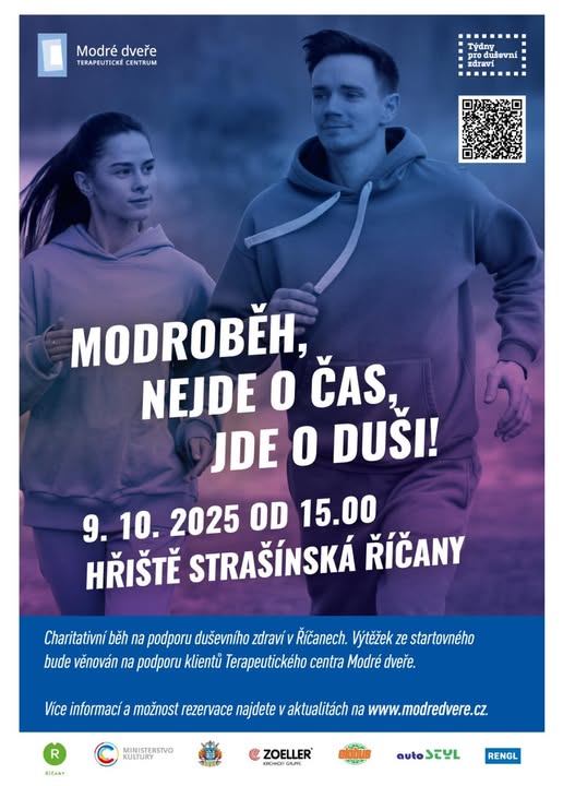 🏃 NEJDE O ČAS, JDE O DUŠI – MODROBĚH 2025 👟 Zapojte se do benefičního běhu, kde nám nejde nejde o sportovní výkony, ale o podporu dobré věci. Přijďte si zaběhat, projít se, nebo si jen užít odpoledne plné pohybu a skvělé nálady. ☺️ 📅 9. října | 15:00–19:00 📍 Říčany – hřiště Strašínská 💸 Startovné: 50 Kč děti | 200 Kč jednotlivci | 300 Kč rodinné vstupné 📝 Registrace: na místě od 15:00 nebo online ▶️ http://bit.ly/3JD9DEu Připravili jsme si pro vás dvě náročnosti tratě: 👶 1,8 km – pro rodiny, seniory a začátečníky 🔥 5,3 km – pro zkušenější běžce Podpořte myšlenku Modroběhu tím, že si na sebe obléknete něco modrého. 💙 Akce probíhá ve spolupráci se Sborem dobrovolných hasičů Říčany 🚒. Výtěžek z akce podpoří Terapeutické centrum Modré dveře, neziskovou organizaci zaměřenou na pomoc v péči o duševní zdraví 💙 Velké díky patří i našim partnerům, bez vás by to nešlo. 🙏🏻 Město Říčany | Ministerstvo kultury České republiky | Hasiči Říčany | RENGL | Zoeller Systems sro | AUTO STYL a.s. Těšíme se na vás! 🏃♀️ (fb)