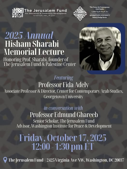 The 2025 Hisham Sharabi Memorial Lecture honors the vision and intellectual legacy of Dr. Hisham Sharabi, whose work as a scholar, activist, and founder continues to shape Arab studies and advocacy today. This year, as the Center for Contemporary Arab Studies (CCAS) at Georgetown University, founded by Sharabi and his colleagues, marks its 50th anniversary, we are proud to partner with CCAS to reflect on that enduring impact. We are honored to host Dr. Fida Adely, Director of CCAS, and The Jerusalem Fund’s Senior Scholar, Dr. Edmund Ghareeb, for a discussion that pays tribute to Sharabi’s lifelong commitment to advancing critical scholarship and fostering dialogue on Arab society, politics, and culture. 🗓️Date: Friday, October 17, 2025 ⏰Time: 12:00 – 1:30 pm ET 📍Location: The Jerusalem Fund (2425 Virginia Ave NW, Washington, DC 20037) (fb)