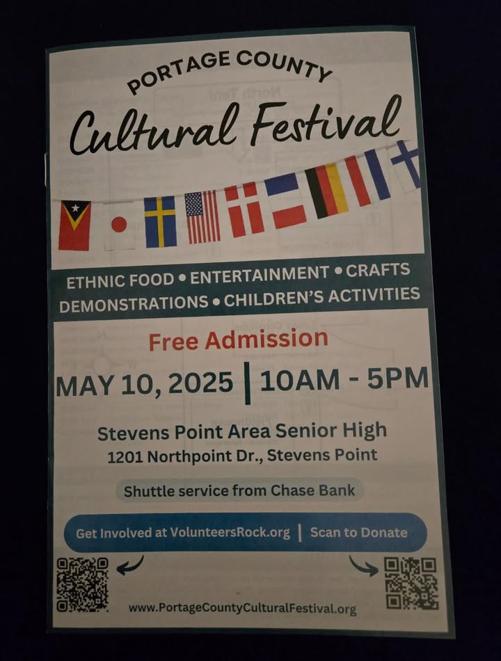 Portage County Cultural Festival Portage County Cultural Festival 2025 Festival Date May 10th 2025 10am 5pm Location Stevens Point Area Senior High Portage County Cultural Festival 2025 Festival Date May 10th 2025 10am 5pm Location Stevens Point Area Senior High WELL SEE YOU INTHE SPRING. THE 2025 FESTIVAL WILL BE HELD ON MAY 10TH. A DAY TO CELEBRATE DIVERSITY CULTURE AND INCLUSIVENESS. The Portage County Cultural Festival is a 1day event designed to celebrate ethnic diversity in Portage County Wisconsin.
