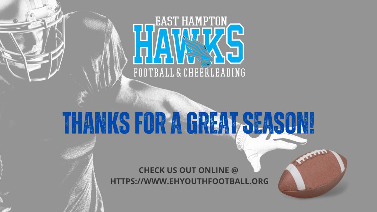 Website Manager East Hampton Youth Football Cheerleading Association East Hampton Youth Football Cheerleading Association Helpful Links CTYFL Connecticut Youth Football Cheerleading League Healthy Eating Habits Youth Football Online Walking onto the field Cheer Squad Cheer B Team on the field Cheerleaders at the game. Helpful Links CTYFL Connecticut Youth Football Cheerleading League Healthy Eating Habits Youth Football Online News Registration for the 2025 season will be open soon and will be announced via email and social media It is with a heavy heart and profound sadness that the Hawks family shares the passing of our Board President Jeff Leith. Field Status East Hampton Middle School FACEBOOK Events Early Bird Discount Ends Contact East Hampton Youth Football Cheerleading AssociationEast Hampton Youth Football and CheerleadingPO BOX 346East HamptonConnecticut06424 Email emailprotected Site Links . .