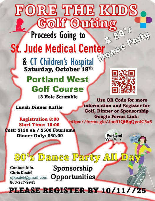 Sharing for our friend Chris at CMK Sporting Goods… Golfers and Sponsors!! Join the "Fore the Kids" Golf Tournament on Oct. 18th! Along with the 18 hole scramble, there will be games, raffles, 80’s music, lunch and dinner. All to help the kids of St. Jude and CT. Children's Hospital. Register by 10/11/25 Space is limited so sign up today! Any questions? You can call or text Chris Koziel @ 860-227-9941 Thank You!! (fb)