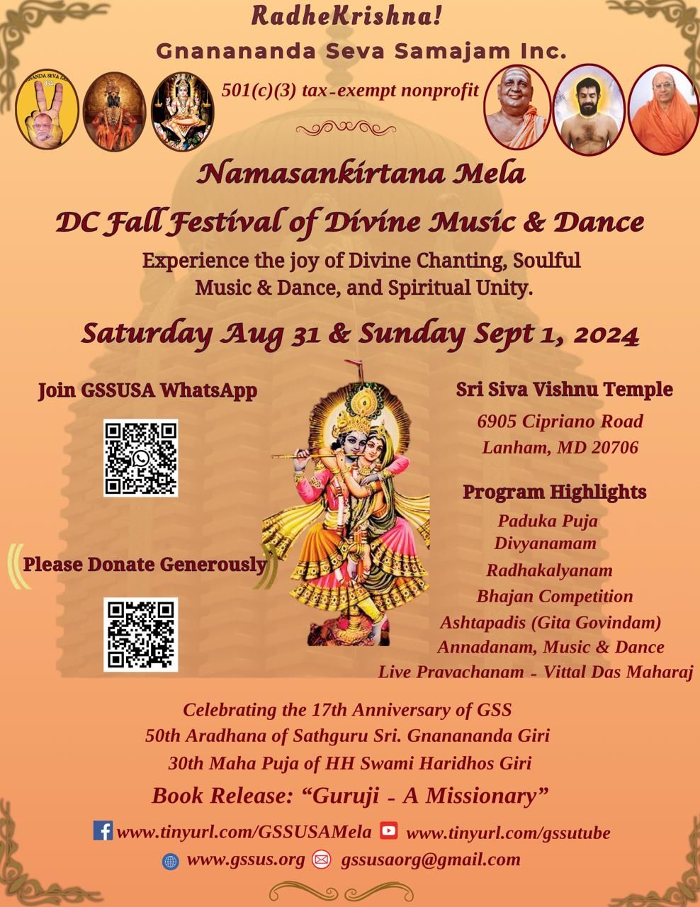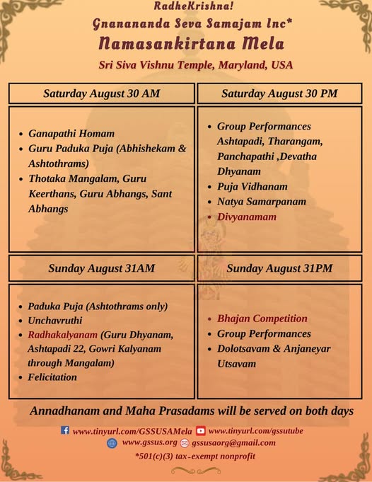 Radhekrishna! ✨ Come, let us lose ourselves in the Divine Names and return with hearts full of bliss! ✨ The mission of Gnanananda Seva Samajam (GSS USA) is to carry forward the age-old tradition of Namasankirtana—singing the Divine Names of Gurus and Gods with Bhakti—to uplift our inner selves and pass this joy to future generations. We invite you, your families, and friends to join the Namasankirtana Mela at Sri Siva Vishnu Temple on Labor Day Weekend – Saturday, August 30 & Sunday, August 31, 2025 (7 AM–9 PM). Senior Bhagavathas, instrumentalists, and many local groups will lead us in two full days of blissful Bhajans. Prasad will be served throughout. No training in music is required—only devotion and love for the Lord. Come, sing, and experience the Divine Bliss of Nama Smarana together with the community. We also lovingly welcome Children & Young Adults to join Nama Mahima - Bhajan Competition to carry forward the tradition of Namasankirtana. If you would like to Volunteer in any capacity, please contact us at gssusaorg@gmail.com. (fb)