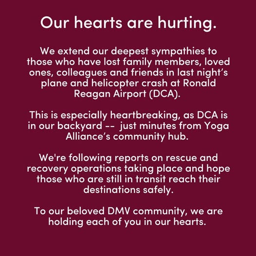 We extend our deepest sympathies to those who have lost family members, loved ones, colleagues, and friends in last night’s plane and helicopter crash at Ronald Reagan Airport (DCA). To our beloved DMV community, we are holding each of you in our hearts. ❤️ (fb)