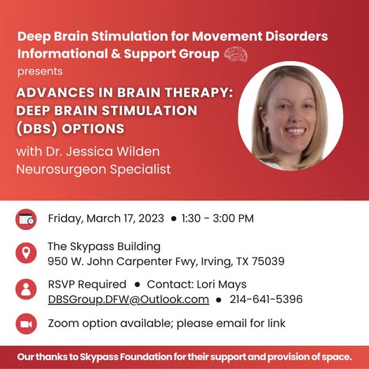 🗓️Two weeks from today! Join online or in person at our HQ in Irving, TX to hear from Dr. Jessica Wilden on advances in brain therapy 🧠 For more information and to RSVP, please reach out to group founder and leader, Lori Mays, at the contact information on the flyer. (fb)