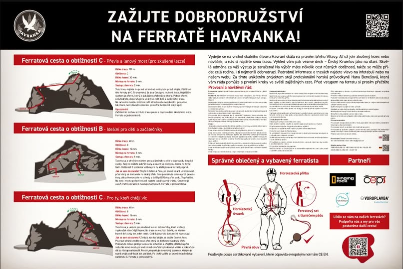 Via Ferrata Havranka Cesky Krumlov Prvni ferrata v Ceskem Krumlove. Ferrata Havranka se nachazi na skalnim utvaru Havrani skala na pravem brehu Vltavy jen par minut chuze z centra Ceskeho Krumlova. V soucasne dobe je zpristupnena prvni trasa ferraty s obtiznosti C druha trasa s obtiznosti B a treti trasa o obtiznosti C. V roce 2025 mame v planu otevrit ctvrtou ferratovou trasu o obtiznosti CD.
