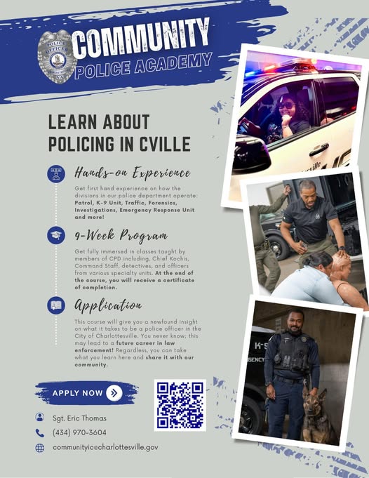 The Community Police Academy provides experiential training on the daily operations and functions of the Charlottesville Police Department (CPD). Classes are taught by members of CPD, including Chief Michael Kochis, Command Staff, and detectives and officers from specialty units. Graduates of the program found the academy to be both informative and rewarding. Below is a list of topics covered in the program: • Introduction and Overview of the Department • Patrol • General Investigations • Forensics • Role of Commonwealth's Attorney Office • Traffic Unit • Recruitment and Hiring/Accreditation • Emergency Communications Center (911) • Internal Affairs • Emergency Response Unit • Firearms/Use of Force • K-9 The Fall Community Police Academy will begin on September 23 and end on November 18 (nine consecutive weeks). Classes will be held every Tuesday evening from 6-8:30 p.m. at the Charlottesville Police Department. Follow the link to download the Community Police Academy application and submit your application to communityic@charlottesville.gov. https://tinyurl.com/2025commpoliceacad *The deadline to apply for the Fall Community Police Academy is Friday, September 19 at 12:00 p.m.* To register and for more information, please contact Sgt. Eric Thomas (Community Involvement Coordinator) at (434) 970-3604 or communityic@charlottesville.gov. (fb)