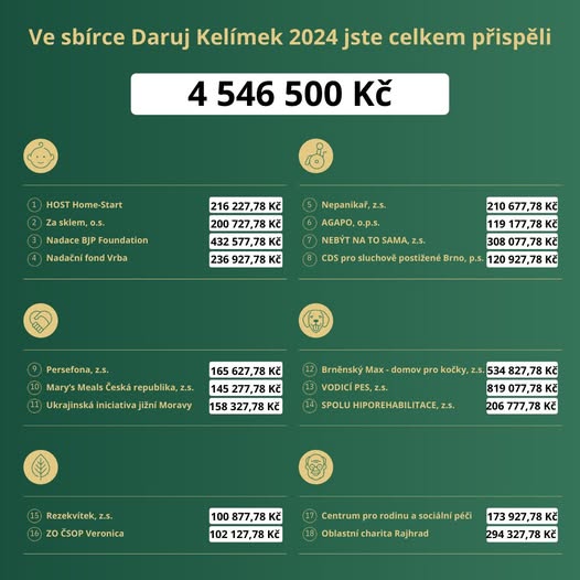Všech 18 dobročinných organizací už má mezi sebou rozdělených celkem 4 546 500 korun. ✨ V průběhu roku tak díky vaší pomoci, kterou jste jim darováním svých vratných kelímků na vánočních trzích v Brně v roce 2024 poskytli, budou rozdávat dobro a radost těm, kteří to nejvíc potřebují. 🥤 💚 Jak organizace s částkami naloží vám ukážeme v období před startem letošních Vánoc 2025 pomocí fotek a videí. 📸 Teď se můžete ale ještě podívat, kolik jste přispěli v roce 2024 jednotlivým dobročinným záměrům. A my ještě jednou děkujeme. 🫶 (fb)