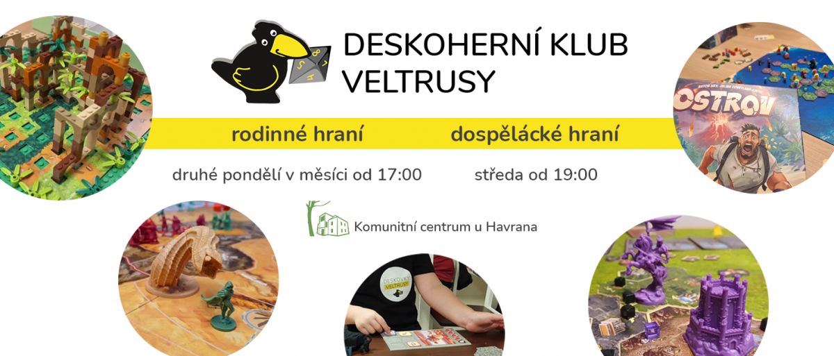 Deskoherni klub Veltrusy Deskoherni klubVeltrusy Pojdte travit volny cas smysluplne hranim modernich deskovych her. Neni to jen zabava jak by se mohlo zdat. Moderni deskove hry jsou skvele na trenink pameti pocitani rozvijeni strategickeho i kritickeho mysleni a v neposledni rade zlepsuji koncentraci. Dospeli hraji kazdou stredu a patek od 1900rodinne hrani s detmi v liche tydny pondeli od 1630 a patky od 1710.
