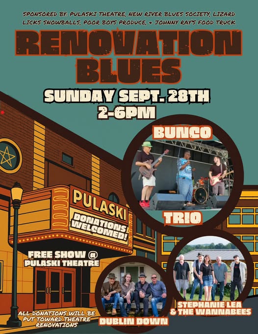 🎷🎤The New River Blues Society will help sponsor a benefit show on behalf of the Pulaski Theatre 🎬on Sunday, September 28, 2025, 2-6 p.m. All donations will be put towards theater renovations. Hope to see you there! // Band Line Up // 💥 Bunco 💥 @StephanieLee&TheWannabees 💥 @DublinDown (fb)