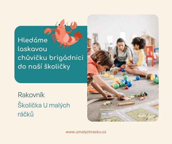 Hledáme laskavou chůvičku do dětské skupiny!🦞 Do naší školičky U malých ráčků v Rakovníku hledáme brigádnici na pozici chůvy. Jste plná energie, kreativity a lásky k dětem? Přidej se k našemu báječnému týmu!❤️ Více informací na https://www.stoskupin.cz/volne-pozice/chuva-brigadnice-do-respektujici-detske-skupiny-v-rakovniku (fb)
