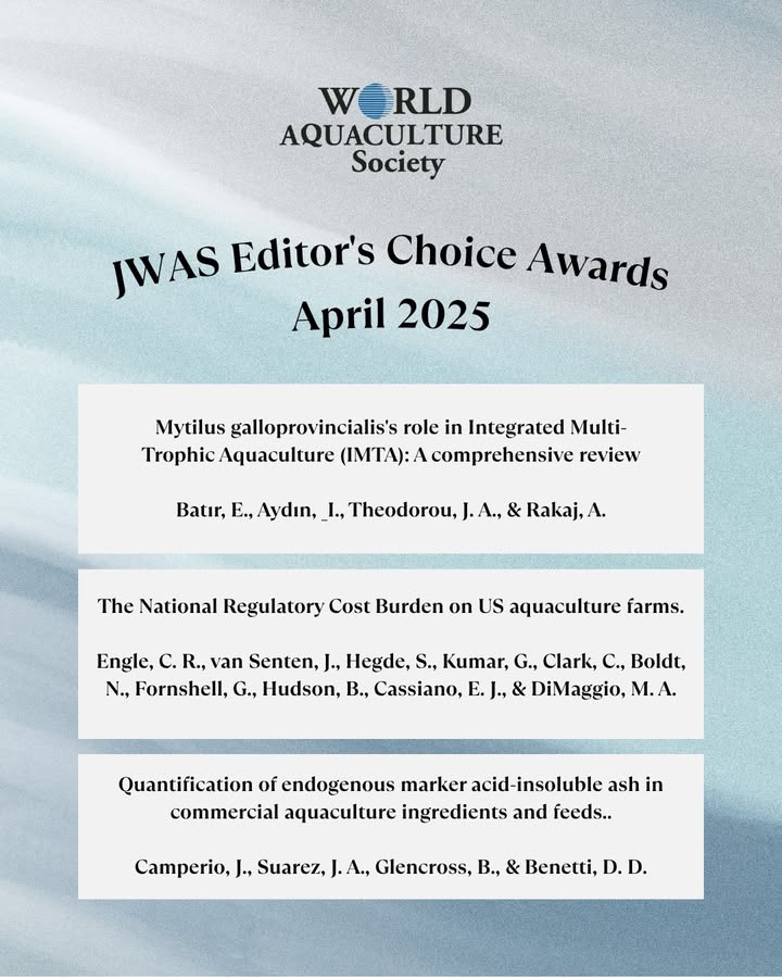 🏆 JWAS Editor’s Choice – April 2025 🏆 April's Editor’s Choice selections from the Journal of the World Aquaculture Society spotlight research tackling real-world challenges in aquaculture—from breeding innovation to pond water quality and fish health. These studies exemplify the impact and innovation happening across global aquaculture. 🔗 Read them here: https://was.org/article/jwas-editors-choice-awards-april-2025.aspx# (fb)