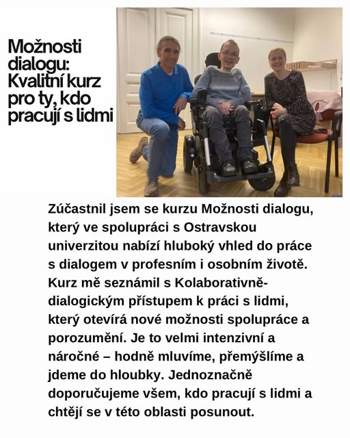 Vřele doporučuju tento kurz: https://www.moznostidialogu.cz Na počátku to vypadalo, že to bude jen zajímavé rozšíření obzorů. Po 6 setkáních to vnímám jako zásadní obohacení mé optiky na svou práci, ale i osobní život…. (fb)