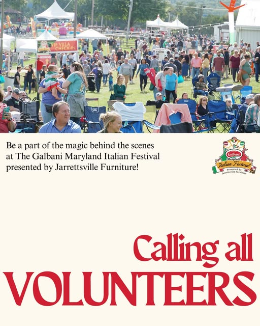 📣 Calling All Volunteers! Be a part of the magic behind the scenes at The Galbani Maryland Italian Festival presented by Jarrettsville Furniture! 🇮🇹✨ We’re looking for enthusiastic, community-loving volunteers to help bring this incredible celebration to life. Whether you're a people person, a problem solver, or just love Italian food and fun, we’ve got a spot for you! 🗓️ Volunteer slots are available from September 23rd–28th 🔗 Sign up now: https://www.signupgenius.com/go/4090D4FA4A62DA3FA7-56496875-festival#/ Let’s make this year’s festa the best one yet—together! 💪🍝 #MarylandItalianFestival #FestivalVolunteers #CommunitySupport #ItalianFestival2025 #GalbaniFestival #JarrettsvilleFurniture #HarfordCountyEvents #SupportLocal (fb)