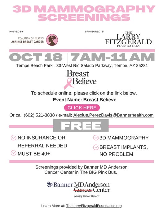 Time is running out to sign up for tomorrow's free 3D Mammograms! Join the Coalition of Blacks Against Breast Cancer (CBAC) and The Larry Fitzgerald Foundation for Breast Believe, a powerful community event promoting early detection and wellness! 📅 Friday, October 18 | 7 AM – 11 AM 📍 Tempe Beach Park ✅ No insurance or referral required ✅ Must be age 40+ ✅ Breast implants welcome! Screenings will be provided by Banner MD Anderson Cancer Center aboard The BIG Pink Bus. 👉 Reserve your spot today: https://bit.ly/44rqr73 or call (602) 521-3838 Let’s stand together for early detection and stronger, healthier futures! 💪🎀 #CBAC #LarryFitzgeraldFoundation #BreastBelieve #BreastCancerAwareness #FreeMammograms #TheBigPinkBus (fb)