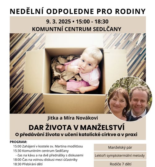 Jsi mladý a chceš jednou založit rodinu?😊 Žiješ v manželství či Tě už jako svobodného zajímá téma, jak prožívat v manželství společnou plodnost se vzájemnou úctou, láskou a věrností? 😍 Zajímá Tě, jak neztratit či nenechat si v čase uplynout mezi prsty dar předávání života?🤔 Nebo naopak, jak dar života v manželství získat, naplnit? 🫠 Zajímá tě, jaká moudra o těchto oblastech píše učení katolické církve?😮 A proč i dnes za nimi stojí.. A chceš se nechat překvapit, co na to říkají dlouholeté zkušenosti z různých oborů a manželství prozkoušené desetiletími? 🫡 Tak to doraž v neděli 7.3. na NOPR 👏 Kde od přednášejících manželů Novákových nebudou chybět ani příklady ze života. 👌 - Jitka a Mirek Novákovi jsou manželé 28 let, mají 7 dětí, 2 vnoučata, jsou lektoři symptotermální metody, mají rádi přírodu, Jitka ráda čte a Mirek rád leze po skalách. Program a jak přihlásit děti najdete na plakátku. Těšíme se na Vás na NOPRovém posezení u kávy. ☕️ (fb)