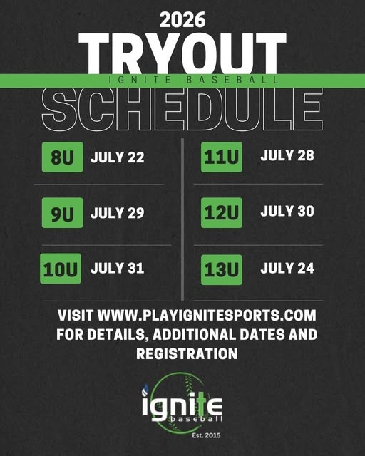 2026 Baseball Tryouts are coming up. Visit www.playignitesports.com for details and registration. (fb)