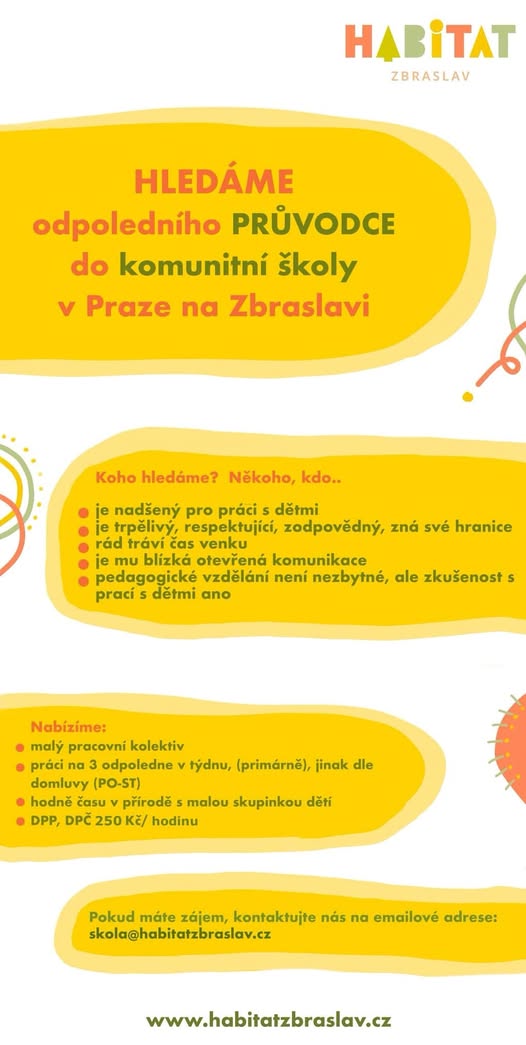 HLEDÁME ODPOLEDNÍHO PRŮVODCE 🌞 Z rodinných důvodů už s dětmi nemůže trávit tolik času naše skvělá odpolední průvodkyně, a proto hledáme náhradu. Hledáme někoho, kdo by měl čas tři odpoledne v týdnu PO - ST od 13:00 (12:30) do 16:30. Děti tráví odpoledne neřízenou činností, podle svého zájmu. Zároveň se ale snažíme dětem vždy nějakou aktivitu nabídnout. Hledáme tedy někoho, kdo bude schopný nastavit hranice volné hře, zároveň bude s radostí přinášet vlastní inspiraci pro činnost. Zájemci mě můžou kontaktovat na skola@habitatzbraslav.cz (fb)
