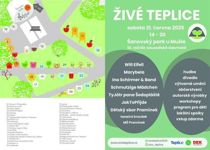 🎉 Už tuto sobotu 21. června se potkáme na sousedské slavnosti Živé Teplice 💛 Najdete nás se stánkem plným zábavných a poučných aktivit pro děti. Připraveny budou úkoly na téma bezpečí a prevence rizikového chování. 👧🧒 📍 Kdy? Sobota 21. června, od 14 hodin 📍 Kde? Teplice, Šanovský park u Mušle 📍 Co? Podrobný program a info 👉 https://www.ziveteplice.cz či 👉 https://fb.me/e/3ckyDZxiw Zastavte se u nás a zjistěte, co děláme a jaké máme plány 💬✨ #ZiveTeplice #HandsOff (fb)