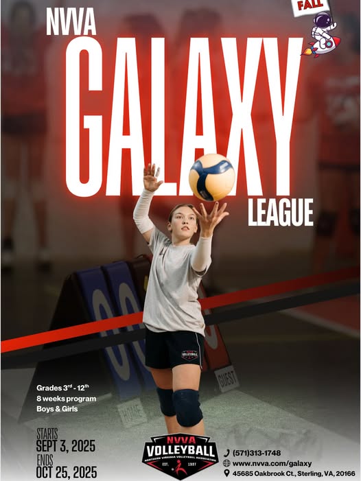 Youth Academy Galaxy League NVVA Camps Club Volleyball Adult Volleyball Beach Volleyball Tournaments Galaxy League Galaxy League NVVA Welcome to your volleyball journey GALAXY LEAGUE 8week program twice a week for beginner and intermediate boys and girls grades 3 12 YOUTH ACADEMY Onceaweek program on Sun Mon Wed for beginners boys and girls ages 5 16 XPERFORMANCE Club Volleyball Program for intermediate and advanced athletes ages 12 to 18 LOUDOUN YOUTH VOLLEYBALL Compete in the largest youth volleyball league in Northern Virginia. For girls and boys ages 1117. NVVA PLUS Weekly skill classes for beginner intermediate and advanced boys and girls grades 6 12 VOLLEYBALL CAMPS Weeklong volleyball training for beginner intermediate and advanced boys and girls grades 3 12 BEACH VOLLEYBALL LESSONS INDOOR VOLLEYBALL LESSONS ADULT LEAGUE Super Nova League and Adult Open Gym ADULT BEACH LEAGUES Play in our indoor volleyball court NORTHERN VIRGINIA CLUB LEAGUE Join our mailing list. Thanks for subscribing.