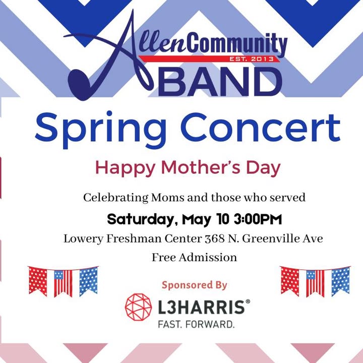 Follow Us Home About Us Concert Info Support Us Contact Us Band Members Only More ANNOUNCEMENTS Join us for our Spring Swing Jazz Band Concert on Saturday April 12 3PM Lowery Auditorium. Join us for our Spring Concert on Saturday May 10 3PM Lowery Auditorium. Join the Allen Community Band. Openings for Oboe Bassoon and French Horn.