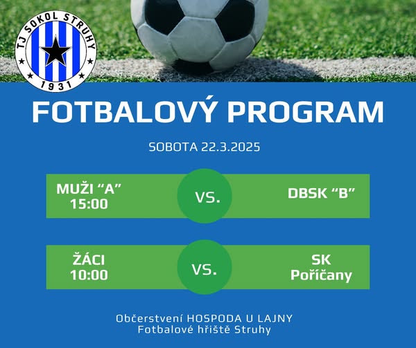 🔵⚪️ Jaro se rozjíždí ⚪️🔵 🌷⚽️ První jarní zápas TJ Sokol Struhy je tu! Přijďte podpořit naše borce a užijte si krásné počasí. Klobása, pivo a dobrá nálada – ať to na hřišti pořádně žije! 🍻🥳 #VesnickyFotbal #SokolStruhy #9liga #Prales #Zachrana (fb)