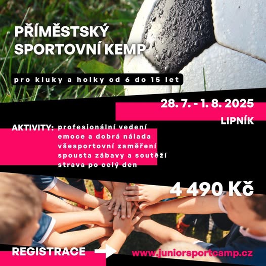 Loni dle ohlasu vládla spokojenost, letos bude bohužel "Příměstský sportovní kemp" na Lipníku, dále však s naší podporou. Změna místa je z důvodu nedohody provozovatele kempu a hospody. I tak věříme, že si děti užijí týden zábavy na "spřáteleném" Lipníku, více info a přihlášky zde: www.juniorsportcamp.cz/ (fb)