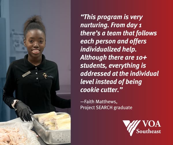 VOA Southeast empowers individuals to achieve stability through meaningful employment, guiding them every step of the way. Our supported employment services offer personalized job coaching, skill development, employer relationship building, and ongoing support for long-term success for people from all backgrounds and abilities. “This program is very nurturing,” said Tandra Matthews, a job coach at VOA Southeast’s Project SEARCH, a supported employment initiative. “From day 1, there’s a team that follows each person and offers individualized help… everything is addressed at the individual level instead of being cookie cutter.” Read more about Project SEARCH and our supported employment services: https://hubs.li/Q03q-Gn_0 #MeaningfulEmployment #VOASoutheast #EmpowerThroughEmployment #EmploymentSupport (fb)