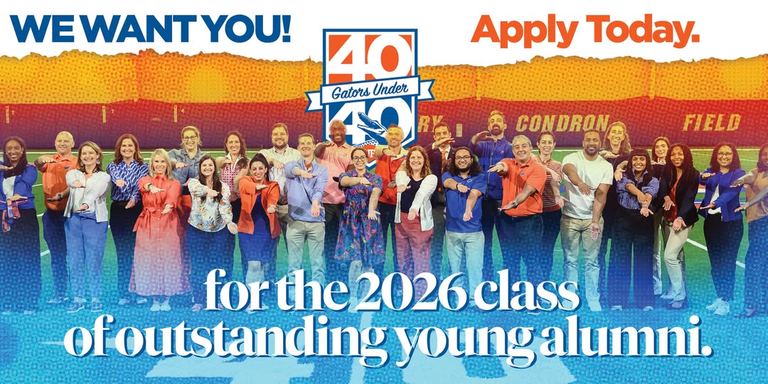 Attention Gators ‼️ The search is ON for the next class of #40GatorsUnder40! We're looking for the trailblazers, the innovators, the Gators who are making a difference in their communities and professions. Do you bleed orange and blue and are making a real difference? Applications close Monday, September 8. APPLY today: https://go.ufl.edu/40gatorsunder40 UF College of Liberal Arts and Sciences UF College of Agricultural and Life Sciences UF Warrington College of Business UF College of the Arts UF College of Design, Construction and Planning UF College of Public Health and Health Professions University of Florida College of Pharmacy University of Florida College of Education University of Florida College of Veterinary Medicine University of Florida College of Health and Human Performance UF Herbert Wertheim College of Engineering UF Digital Worlds Institute UF College of Dentistry UF College of Medicine UF College of Nursing UF College of Journalism and Communications UF Levin College of Law (fb)