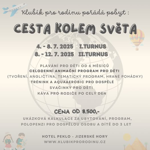 🌍 Cesta kolem světa během 5 dní? Žádný problém! Plavání, tvoření, angličtina a tematický program pro malé i velké cestovatele! Pro rodiče káva po celý den, pro děti spousta zábavy a dobrodružství. Dopřejte si dovolenou, kde si odpočinete a vaše děti budou nadšené z nových zážitků! 📅 Termíny: 4.–8. 7. 2025 nebo 8.–12. 7. 2025 📍 Hotel Peklo – Jizerské hory 👉 Více na: www.klubikprorodinu.cz (fb)
