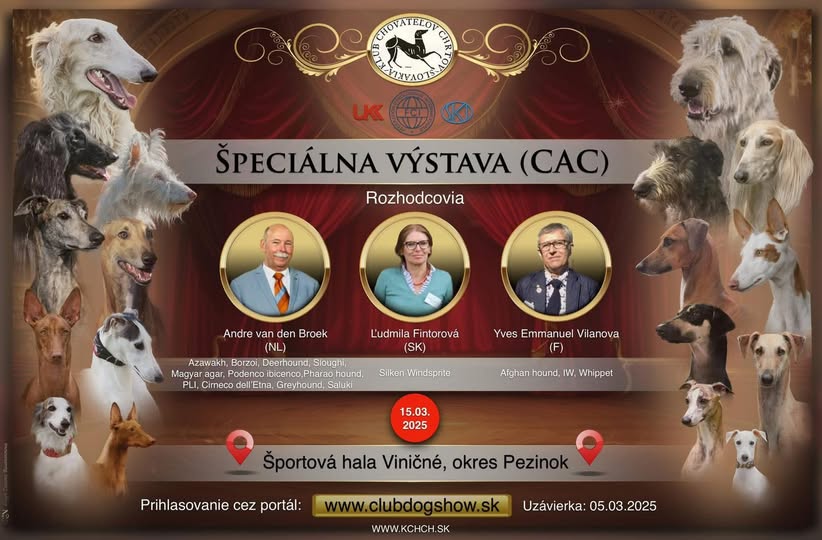 Srdečne Vás pozývame na Špeciálnu výstavu slovenského Klubu chovateľov chrtov🤗❤️ Web: https://www.kchch.sk Prihlasovanie: https://www.clubdogshow.sk #sloughi #azawakh #dogshow (fb)