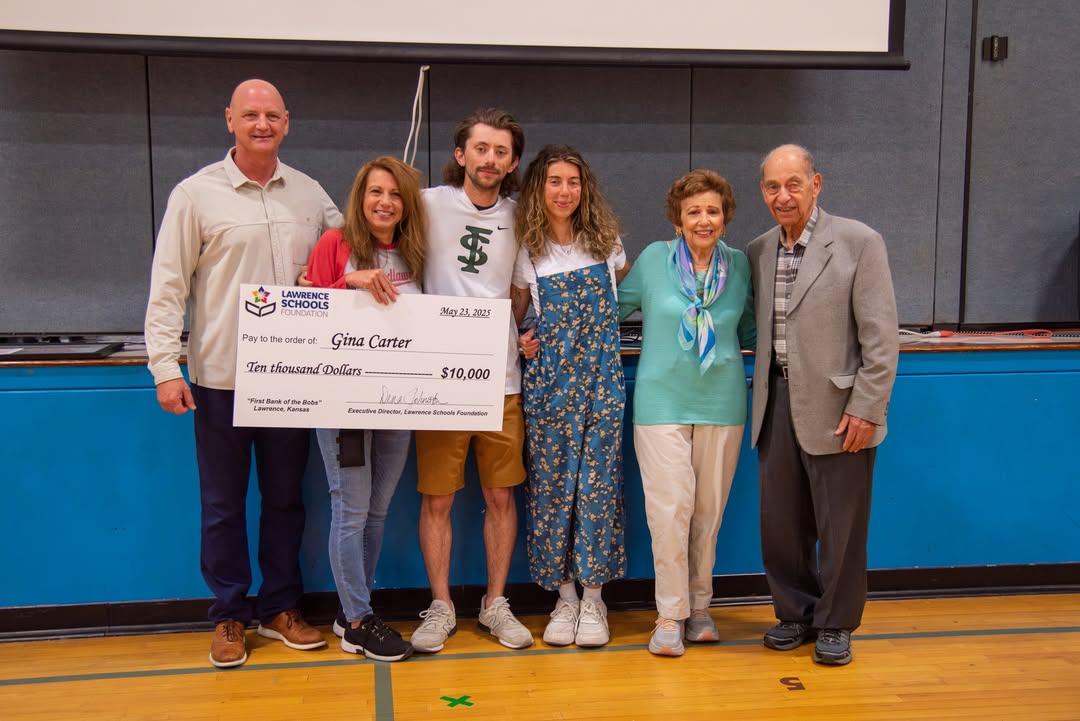 The last day of school, a surprise celebration and $10,000! Lawrence Public Schools and Woodlawn Elementary educator, Gina Carter, was announced as the 2025 Excellence In Teaching Award and a gift of $10,000. The Lawrence Schools Foundation, on Friday, presented the 2025 Excellence In Teaching: Bobs Award, during an all school assembly attended by Carter’s family members, peers, friends, students, former colleagues, Foundation board members and school district leaders. "Gina is the definition of a lifelong learner, and her devotion in mastering the science of teaching reading is both inspiring and impactful. She continuously applies research- based strategies to enhance her instruction, ensuring that every student has the tools they need to succeed at reading,” stated Lisa Melton, former teacher at Woodlawn Elementary. "Gina is a remarkable individual who possesses the ability to develop meaningful relationships with all of her students. Her student-centered approach ensures that she prioritizes the needs of those she works with, creating an inclusive and supportive environment. Gina looks to the needs of students and provides individualized instruction to those students. She builds relationships with her students and provides love and acceptance to all students, even on their difficult days. The students in our building all look forward to working with Mrs. Carter and seeing her smiling face around the building, ”remarked Woodlawn Elementary Title Reading teacher, Cathy Huebner. More than 28 years ago a group of civic leaders, who share the same first name of Bob, created the award through the Foundation. The benefactors choose to remain anonymous to focus attention on the outstanding educators selected annually to receive the award. The Bobs Award honors a teacher who “exemplifies extraordinary instruction skills; reflects commitment to quality education and dedication to teaching; focuses on individual student achievement; administers to the whole child, guiding each student to achieve his full potential; and is deemed to be proficient, caring, adaptable, and professional.” Carter is the 29th recipient of this annual and prestigious award. (fb)