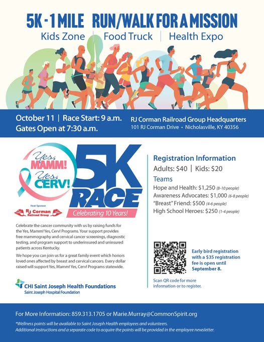 DYK that since its inaugural race in 2015, the Yes, Mamm! Yes, Cerv! program has provided over 6,200 underserved patients with mammography screenings and over 1,800 women with cervical cancer screenings? This year, we are thrilled to celebrate a decade of this program providing invaluable services to the patients and communities we serve. To help us celebrate this exciting milestone, register to run at this year’s special race event before August 31 and receive an early bird registration fee of only $35. The race starts at 9 a.m. on Saturday, October 11, at the RJ Corman Railroad Group campus in Nicholasville. Sponsor team registration is also available – gather your team of 4, 8 or up to 10 to participate as a group. To register, visit https://ow.ly/NFyS50WMrEA. We will see you there! (fb)