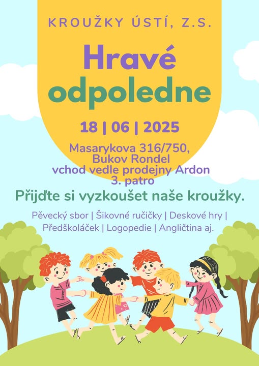 Srdečně zveme na Hravé odpoledne. Přijďte si vyzkoušet naše kroužky a zjistit, jaká nabídka Vás čeká příští rok.. 🥳 Ve středu 18.6. od 15 do 18 hodin. Těšíme se na Vás ❤️ (fb)