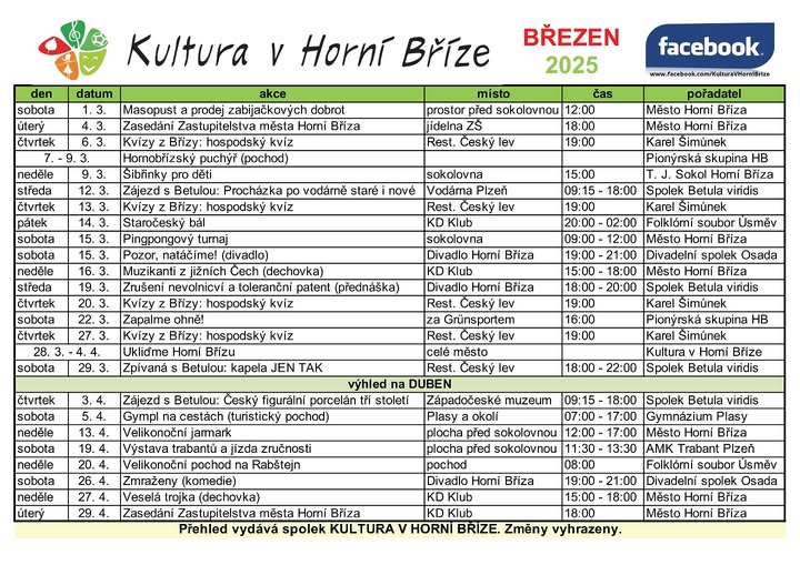 Přehled kulturních a společenských akcí na březen 2025 zve k mnoha příležitostem vyžití v Horní Bříze. (fb)