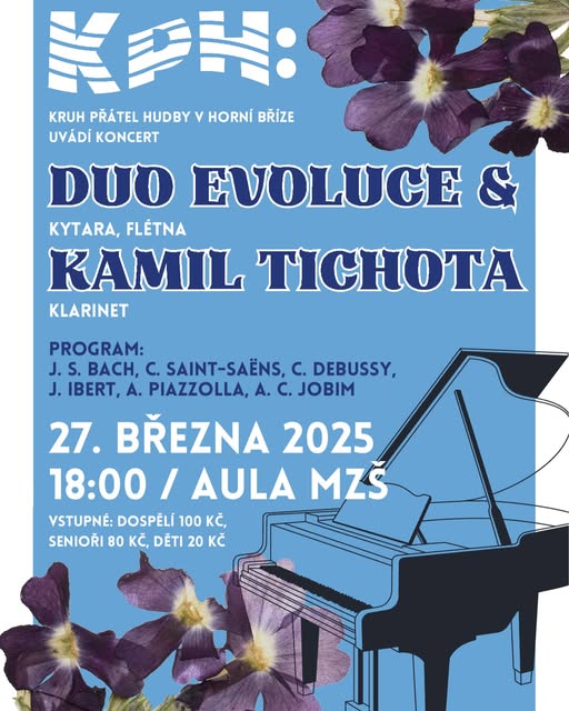 Kruh přátel hudby v Horní Bříze uvádí koncert klasické hudby Duo Evoluce a Kamil Tichota, který se uskuteční ve čtvrtek 27. března 2025 od 18:00 divadle Horní Bříza/aule základní školy. Všichni jste srdečně zváni. (fb)