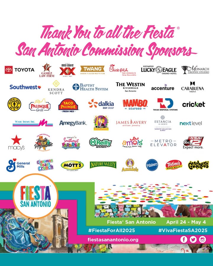 The Fiesta® San Antonio Commission would like to thank all of our Sponsors and Partners who supported Fiesta 2025! HAVE FUN. GIVE BACK. FIESTA. *Sponsors and Partners at the time of publishing #VivaFiestaSA2025 #FiestaForAll2025 (fb)