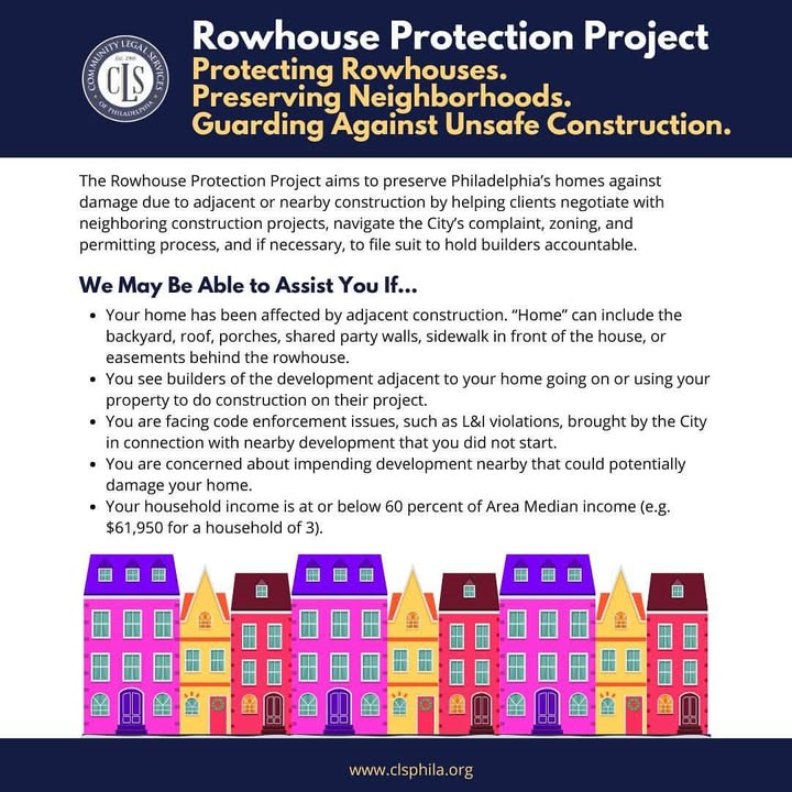 Repost from @clsphila • The Rowhouse Protection Project aims to preserve Philadelphia’s homes against damage due to adjacent or nearby construction by helping clients negotiate with neighboring construction projects, navigate the City’s complaint, zoning, and permitting process, and if necessary, to file suit to hold builders accountable. We May Be Able to Assist You If... - Your home has been affected by adjacent construction. “Home” can include the backyard, roof, porches, shared party walls, sidewalk in front of the house, or easements behind the rowhouse. - You see builders of the development adjacent to your home going on or using your property to do construction on their project. - You are facing code enforcement issues, such as L&I violations, brought by the City in connection with nearby development that you did not start. - You are concerned about impending development nearby that could potentially damage your home. - Your household income is at or below 60 percent of Area Median income (e.g. $61,950 for a household of 3). Know your rights! Visit the link in our bio to learn more and request legal assistance. Image description: Rowhouse Protection Project flyer with the text in this caption above a colorful illustration of rowhouses. (fb)