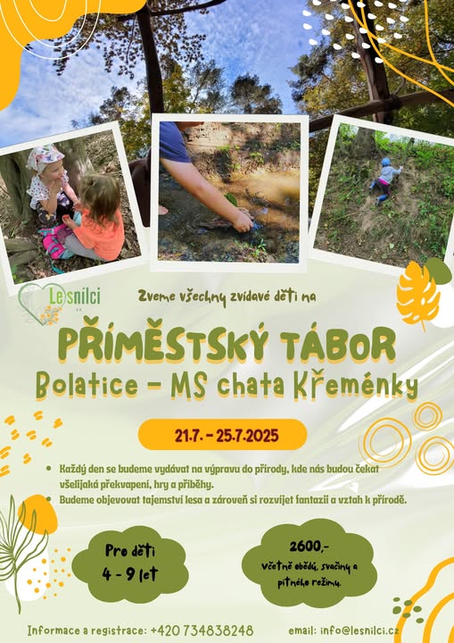 🌲 Léto v lese pro děti, klid a jistota pro rodiče! 👨👩👧👦 POZOR! Změna věkového rozmezí až do 9let! Hledáte smysluplný program pro děti na prázdniny? 🎒 Na našem příměstském táboře v přírodě zažijí každý den dobrodružství, zatímco vy můžete v klidu pracovat nebo odpočívat. ✅ Hlídání každý den od rána do odpoledne ✅ Příroda místo obrazovek - les, čerstvý vzduch, hry, tvoření i výlety ✅ Žádné spaní mimo domov – dítě je večer zase s vámi ✅ Dostupnější než pobytový tábor 📅 Máme ještě volná místa! 📍 Bolatice - MS chata Křeménky ℹ️ Více info a přihlášky: info@lesnilci.cz, 734838248. 👉 Dopřejte dětem léto, na které budou vzpomínat – a sobě pohodu, že je o ně postaráno. 🌞🌿 (fb)