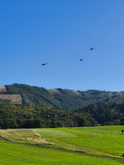 Přílet vrtulníkové letky z Náměště nad Oslavou na Dny NATO v Ostravě / NATO Days in Ostrava. Nad plochou Peter’s Ground v Obec Kunčice pod Ondřejníkem provedli dvě otočky a hurá na Mošnov. Kluci děkujeme, bylo nám ctí. (fb)