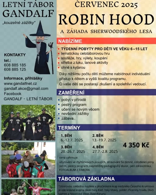 Hledáte jedinečný letní tábor pro své dítě nebo známé? Dobrá zpráva – máme ještě volná místa 😊 Nabízíme napínavý a dobrodružný příběh ze středověku na téma Robin Hood, skvělé hry a aktivity, nové a pozitivní zážitky i zkušenosti, úžasný týden, který dokonale obohatí celé prázdniny. Mrkněte na http://www.gandalfnet.cz/ Děkujeme za sdílení a reference 😊 (fb)