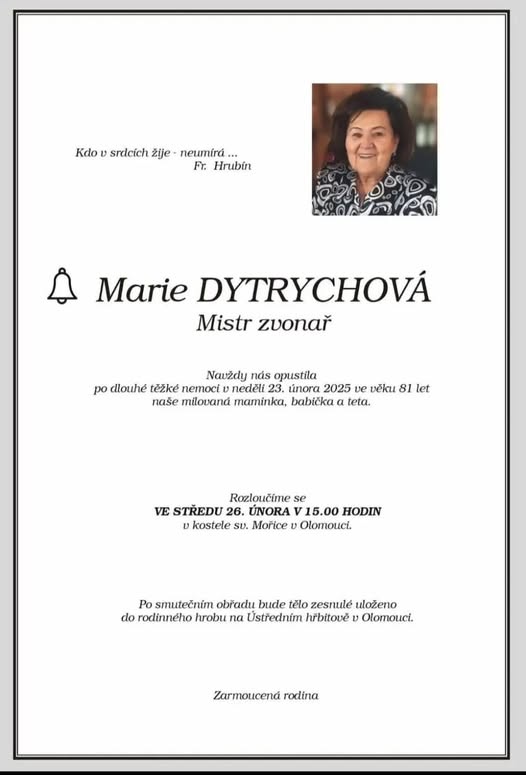 Zvonařskou a zvonickou komunitu postihla smutná zpráva. Zemřela Marie Tomášková - Dytrychová, mistr zvonař, pokračovatelka rodinné tradice lití zvonů. Zvonářská dílna v Brodku u Přerova se pod jejím vedením stala jednou z největších v Evropě. Zvony z její dílny zvoní po celém světě. Ve středu 26. února v 16 hodin vzdáme úctu životu a dílu paní Marie zvoněním i v našem kostele. RIP (fb)