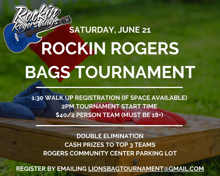 🎯 Bags Tournament Registration is Now Open! 🎉 Join us for the Rockin’ Rogers Days Bags Tournament on Saturday, June 21! Grab a partner and show off your cornhole skills in a fun and friendly competition. 👥 2-person teams 📧 Register by emailing: lionsbagtournament@gmail.com Spots fill up fast—don’t wait! (fb)