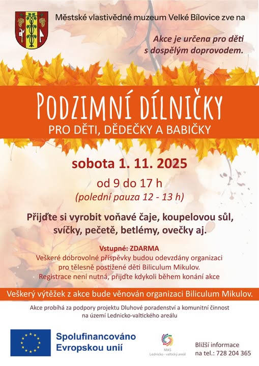 🍁 Podzimní dílničky v muzeu! 🍁 Zveme všechny děti, babičky i dědečky na tvořivé Podzimní dílničky! 🗓 Sobota 1. 11. 2025, 9–17 h (polední pauza 12–13 h) 📍 Městské vlastivědné muzeum Velké Bílovice (fb)