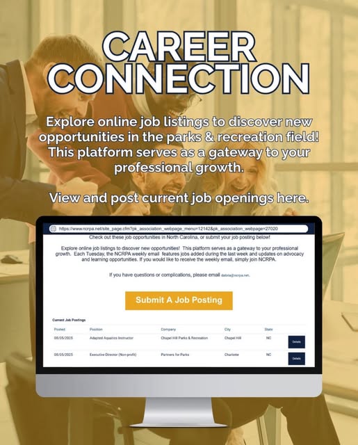 Looking to hire or apply for positions in park & rec? We’ve got you covered! Visit our career Connection page to discover and submit current open positions in the field.🔎 🔗 Visit www.ncrpa.net/site_page.cfm?pk_association_webpage_menu=12142&pk_association_webpage=27020 (fb)