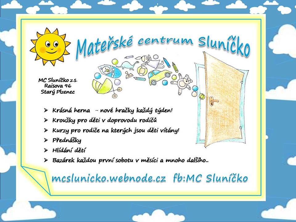 Mraky zazitku pro Vase slunicka Napsali o nas MC Slunicko je ta nejlepsi vec ktera se za posledni dobu v Plzenci stala . Skvely pristupochota. V centru je cisto hracky se kazdy tyden meni. Navstevuji i cviceni a ma lina dcerka se snazi rozlezt pod skvelym vedenim a syn si zatim pohraje.