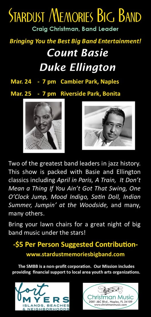 Last night's show was fantastic and we're doing it again tonight at Riverside Park in Bonita! Come out and hear some of the greatest hits from Count Basie and Duke Ellington performed by The Stardust Memories Big Band. Show starts at 7 pm and the weather is going to be great once again, hope to see you there! (fb)