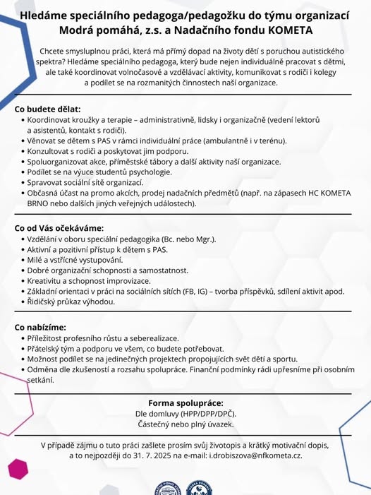 Hledáme kolegu/kolegyni do týmu! 💙 V případě zájmu nám zašlete Váš životopis na i.drobiszova@nfkometa.cz #team #nfkometa #modrapomaha #vicnezhokej #autism #specialnipedagog (fb)