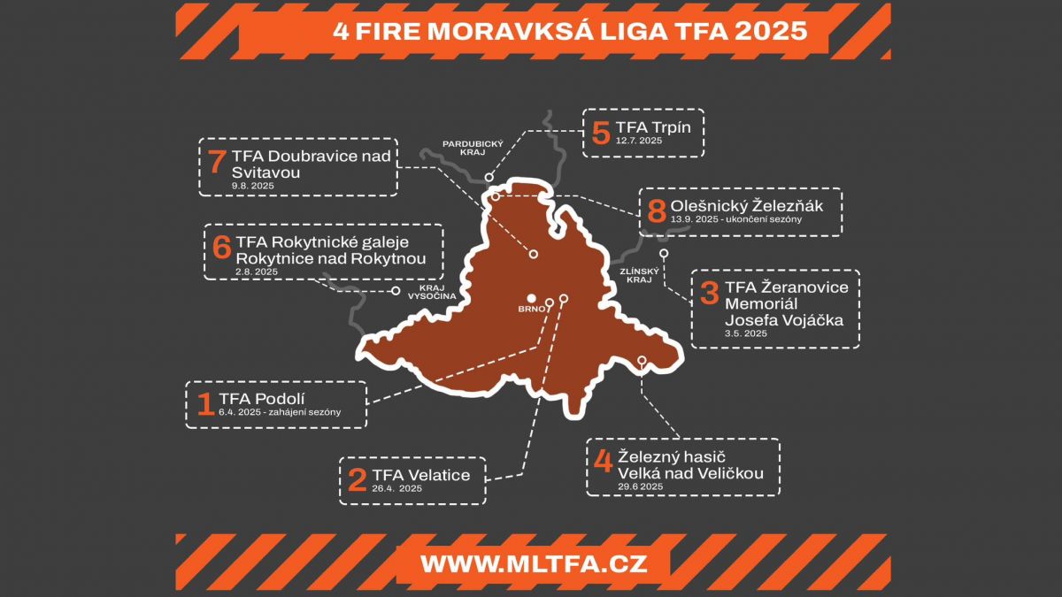 MORAVSKA LIGATFA MLTFA Moravska liga TFA byla zalozena v roce 2017 peti zakladajicimi sbory. SDH Olesnice SDH Velatice SDH Doubravice nad Svitavou SDH Sebranice a SDH Trpin. Od roku 2019 pribyly do kalendare ligy zavody poradane dalsimi dvema sbory SDH Bedrichovice a SDH Podoli. Od sezony 2020 se Moravska liga rozrostla o dalsi zavod poradany SDH Velka nad Velickou ktery nahradil zavod v Bedrichovicich.