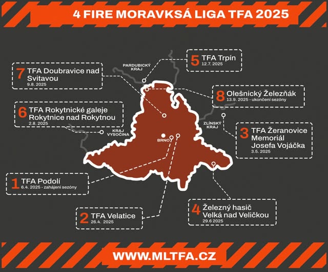 🗓️ Přejeme všem krásné pondělí a k ranní kávě přinášíme trochu vzrušení, ať nám u toho pracovního nasazení neusnete! 💤 4Fire Moravská Liga bude mít letos poprvé 8️⃣ závodů a těšit se můžete na nováčka, o kterém jsme vás informovali v posledním příspěvku! No my se těšíme moc! 🤗 Tak pojďme na to: 6.4.2025 TFA Podolí 26.4.2025 TFA Velatice 3.5.2025 Memorial Josefa Vojáčka TFA Žeranovice 29.6.2025 Železný hasič Velká nad Veličkou 12.7.2025 TFA Trpín 2.8.2025 TFA Rokytnické galeje Rokytnice nad Rokytnou 9.8.2025 TFA Doubravice nad Svitavou 13.9.2025 Olešnický Železňák Vyhlášení se poprvé uskuteční v Olešnici a my jsme už teď zvědaví, co si pro nás kluci po zdolání Dobijáku připraví!😎🍾 Na všechny staré i nové tváře se moc těšíme a už teď vše pilně ladíme a připravujeme 🥰 (fb)